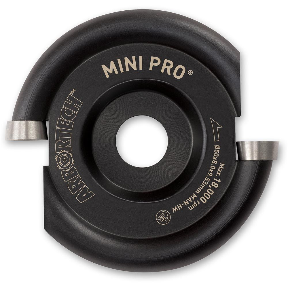 • The Mini Pro is a 50mm diameter blade with 2 tungsten carbide cutting teeth. These teeth are circular and rotatable, ensuring you get the maximum possible use from their edges. When eventually worn they are easy to replace. You can use this versatile blade to cut on its edge or its face. It performs rough shaping or fine detailing with equal ease. Suitable for small to medium projects.