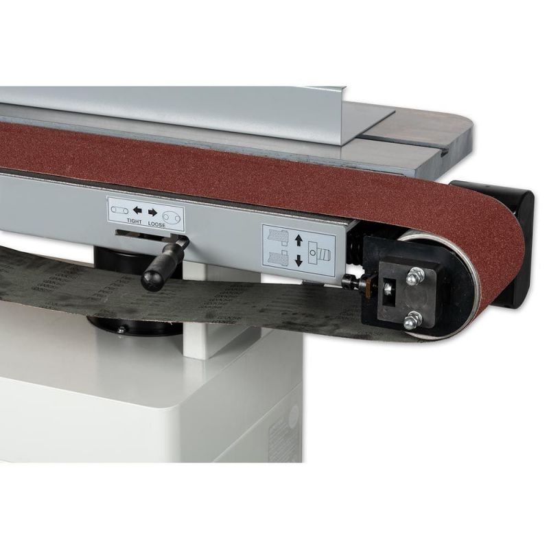 - This compact belt sander is a well made and relatively simple machine. With a 2.2kW motor driving a 150mm wide belt, it is one of the most useful machines to have in any woodworking workshop. The belt drive has an automatic oscillating action to provide a scratch-free finish and longer abrasive life. The belt also runs on a graphite anti-friction plate. The whole belt platen can tilt through 90° from vertical to horizontal, the precision ground cast iron table being easily adjusted in two planes to suit.