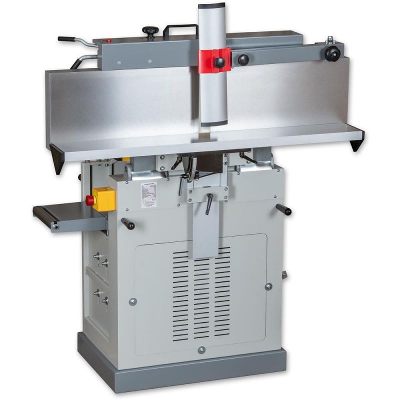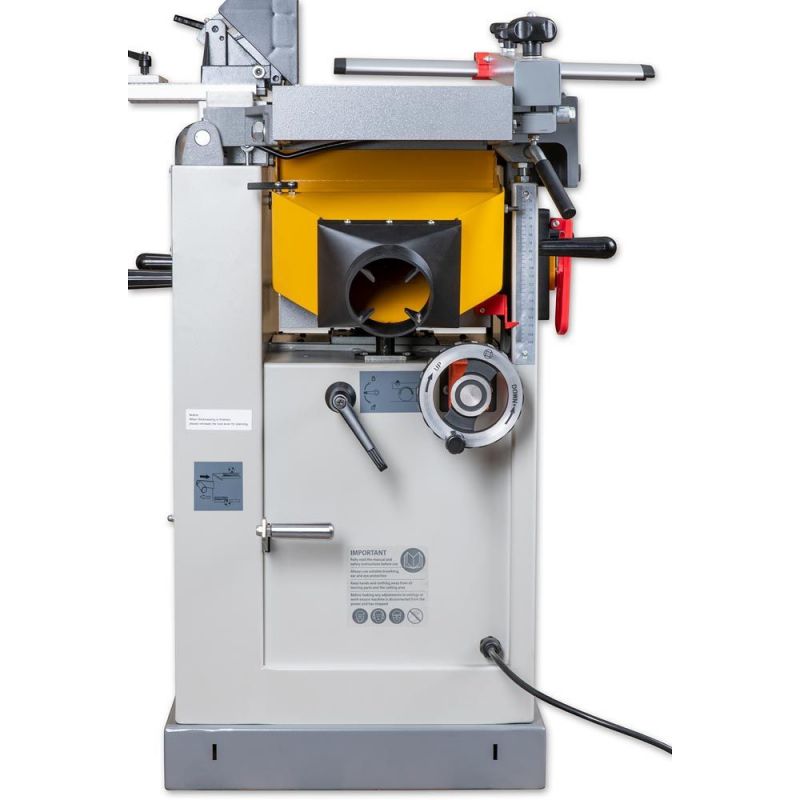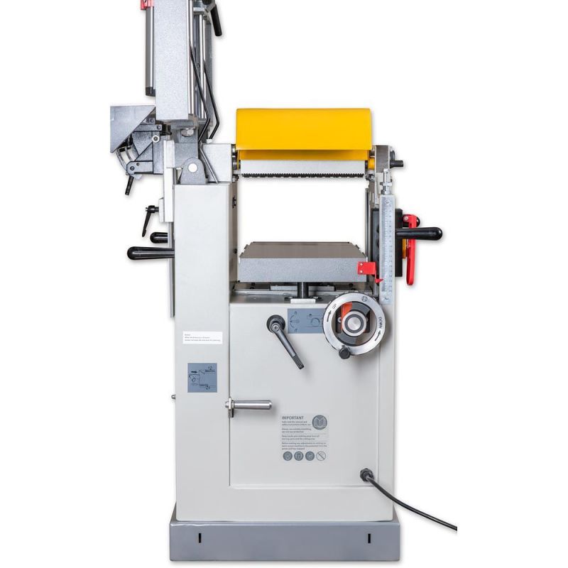 • This is a planer thicknesser, designed and built to withstand heavy use on a daily basis in any professional workshop. The long cast iron surfacing tables are completely adjustable to the cutter block to avoid sniping. A long, rigid alloy fence with stops at 90° and 45°. supports your work. There is a bracket on the rear of the machine to store the fence when not in use. The tables are hinged independently and latch securely for thicknessing. The thicknessing table adjusts smoothly and a digital height indicator allows for accurate measurement of the cut. Chip extraction is via a hinging flip-over hood which is electrically interlocked for safety. The power feed of 5m/min ensures a smooth, even finish.