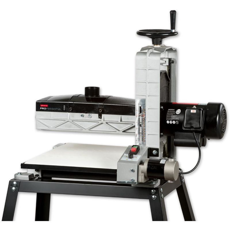 - The open sided design allows wide boards up to 812mm to be sanded by running through from both sides. There is a hand control wheel for the sanding depth, with an indicator scale. A 0.75kW motor drives the drum, with a variable speed unit controlling the conveyor feed speed. The conveyor belt is easy to track, and there are shims provided to ensure that the conveyor belt is parallel to the sanding drum.