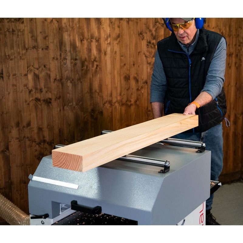 - Designed with busy workshops in mind, the AP410T Thicknesser combines a compact footprint with a robust cast iron table measuring 600 x 408mm. This solid construction provides excellent stability and vibration resistance, ensuring consistent results even under demanding workloads. Front and rear extension tables add vital support for longer workpieces, improving feed stability and helping to minimise snipe at both entry and exit points.