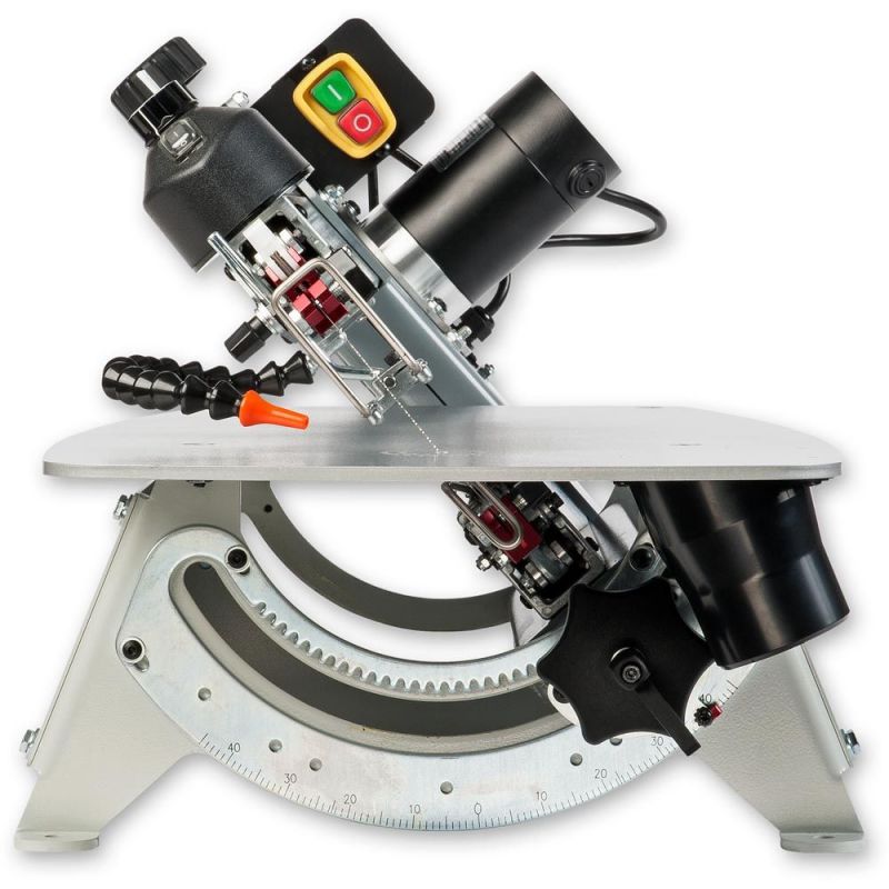 - The arm assembly tilts up to 45° to the right and 35° left leaving the table horizontal. With your workpiece level, you automatically have greater control and precise cuts are easier to achieve. Visibility is improved and work carried out in a natural position. The saw has a 345mm x 597mm, heavy gauge, epoxy coated plate steel table, giving plenty of support to larger workpieces. Blade changing could not be made easier. No tools required, PEGAS blade clamps are lightweight, reduce vibration and reduce stress on the machine. Changing a blade is a simple matter of operating a quick release lever. When carrying out pierced work, you can raise the upper arm to give yourself more clearance to thread the blade through the hole in the workpiece.