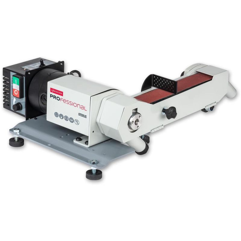 - The possibilities of the Ultimate Edge are endless. The machine has a 560W DC brush motor, which has high torque and is quiet running. The variable speed allows you to match the speed to the type of abrasive and the tool. Dust extraction ports top and bottom allow effective extraction whether running forward or reverse. The belts can be easily changed with a quick release door lock, an auto-tension lock, and easy-to-adjust belt tracking. The belt platen is fully adjustable to the belt; an optional graphite slip plate is provided. There is a simple table provided as standard. The base is 5mm plate steel and is provided with adjustable feet for bench mounting. Supplied with a 240 grit aluminum oxide belt.