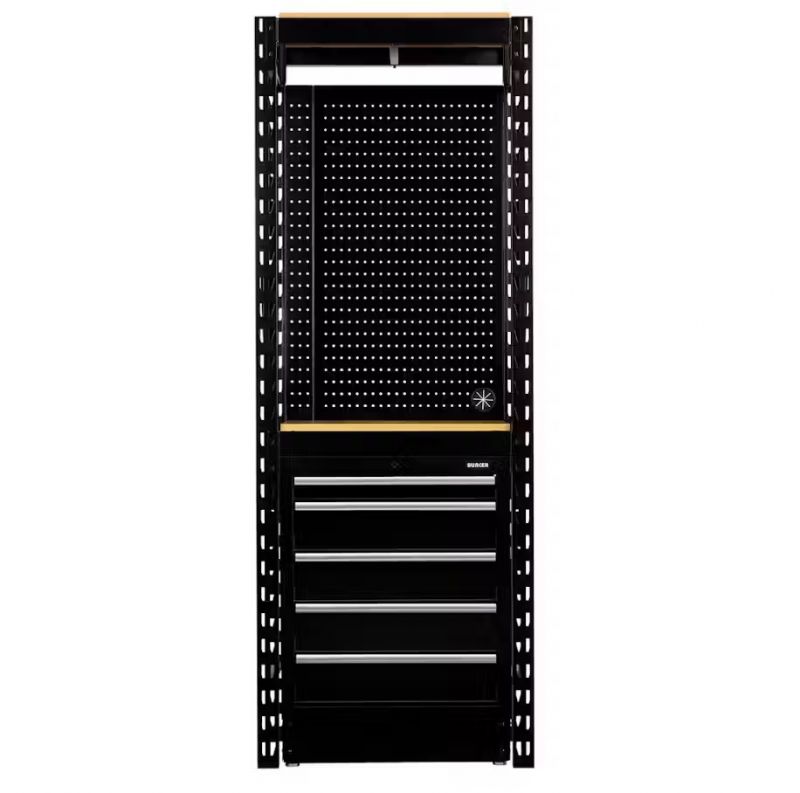 - This modular storage combo features stainless steel or hardwood shelving with pegboards and floor cabinets for additional storage space.