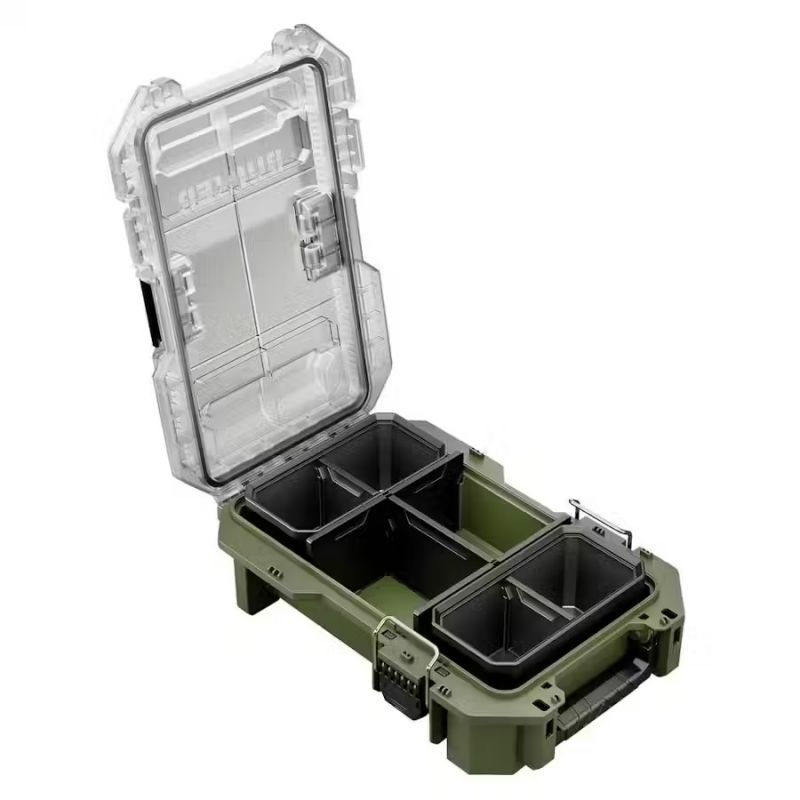 - This half organiser is constructed from high-impact resistant polypropylene. Inside, you will find two bins (compatible with side rails) and dividers for keeping small parts and components safe and organised. The transparent lid offers easy visibility of the contents, while the integrated carry handle enhances portability.