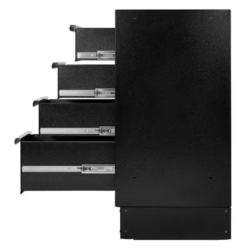 - Its matt black textured finish is highly durable and protected against scratches, wear, and corrosion thanks to the industrial powder coating. Additionally, the cabinet's adjustable feet ensure optimal positioning on uneven floors