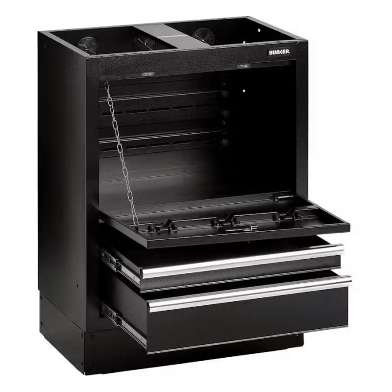 - The BUNKER® modular floor reel cabinet, equipped with two drawers, is specifically designed to keep cable and air hose reels organised and tidy. Capable of holding up to three reels (reels not included), it also features two additional drawers with smooth soft-close operation and foam lining for storing tools and equipment.