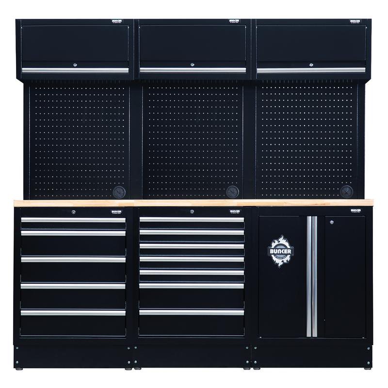 - The BUNKER® 14-piece modular storage combo, available with a hardwood or stainless steel worktop, is the ideal storage solution for garages, workshops, and more. This 2040mm modular combo features a variety of floor cabinets, wall cabinets, pegboard panels, and wall brackets, providing everything you need to transform and optimise your space.