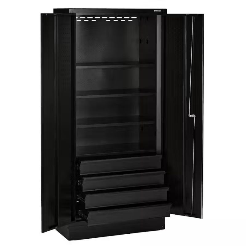 - Inside this tall floor cabinet, you'll find four adjustable shelves and soft-close drawers lined with foam to protect your tools when not in use. For added security, the cabinet is equipped with an integral lock and comes with two keys for peace of mind. Assembly is required, but all necessary fittings are included for easy setup.