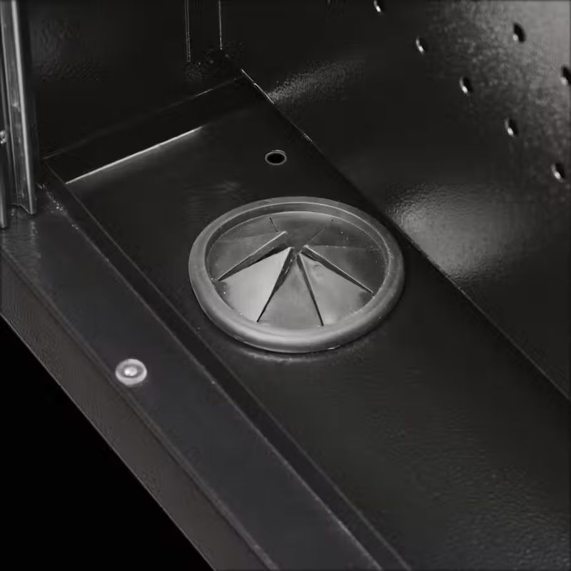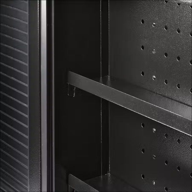 - This wall cabinet features tambour-style doors for convenient access, four adjustable shelves, and a pegboard for organising and displaying your tools. Its matt black textured finish provides a contemporary look, while the industrial powder coating protects against scratches and wear, ensuring longevity and durability.