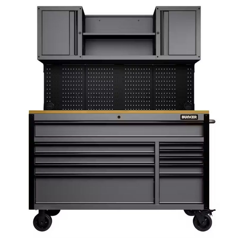 - If you are looking for the perfect tool storage solution for your garage or workshop, look no further than the BUNKER® 56" roller workstation with a workbench and 10 drawers. Manufactured from high-performing steel, this ultimate storage solution offers ample space to optimise your current setup and boost workplace efficiency.