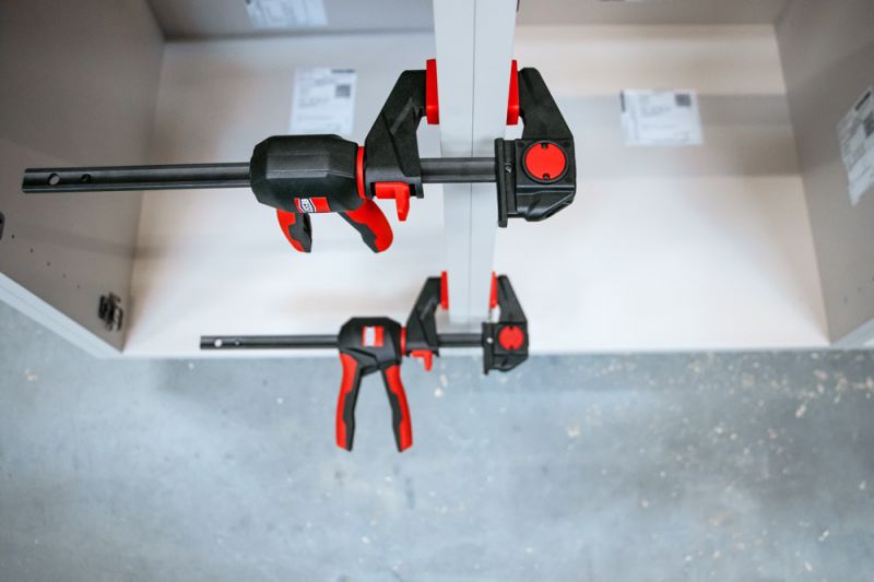 On the one hand, the handle can be positioned in such a way that an optimum pumping position and therefore better application of force is achieved. Secondly, the handle can also be swiveled out of the working area after the clamping process, allowing several clamps to be positioned in the tightest of spaces when used as a one-handed clamp: