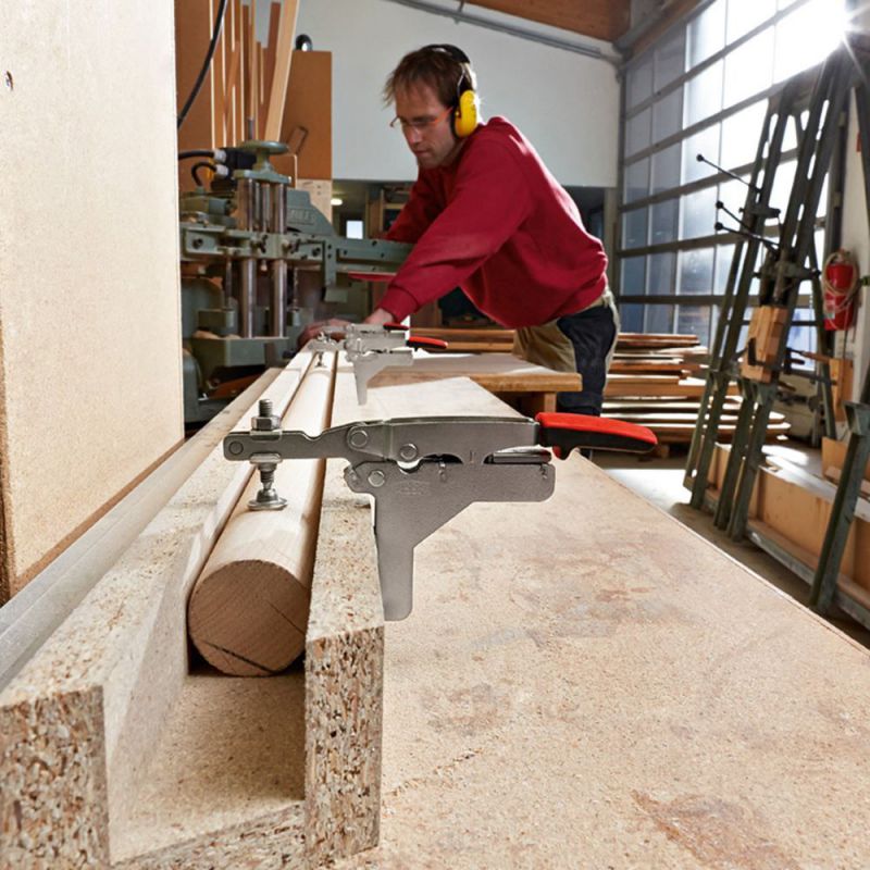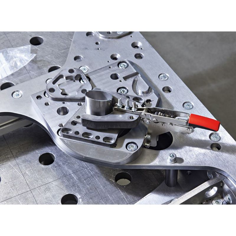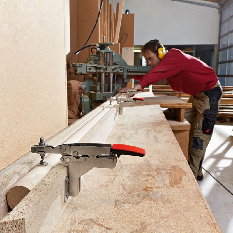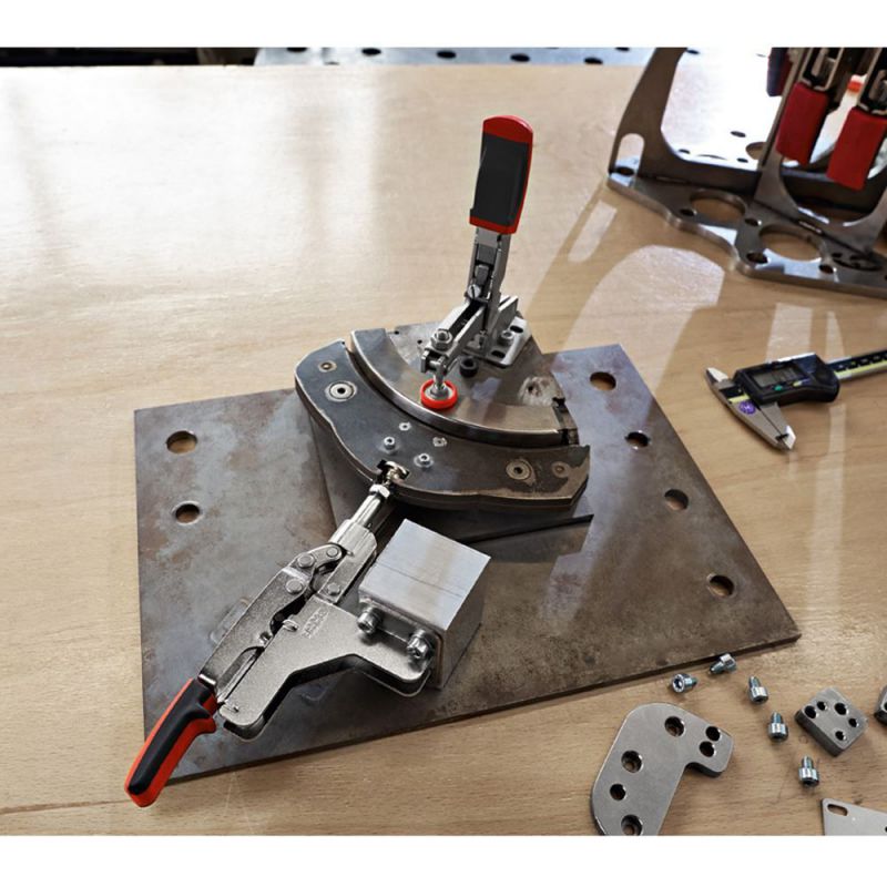 - Ergonomic handle The plastic injection moulded and ergonomically designed handle fits well in the hand and has a very good grip. Horizontal toggle clamp with open arm and angled base plate STC-HA