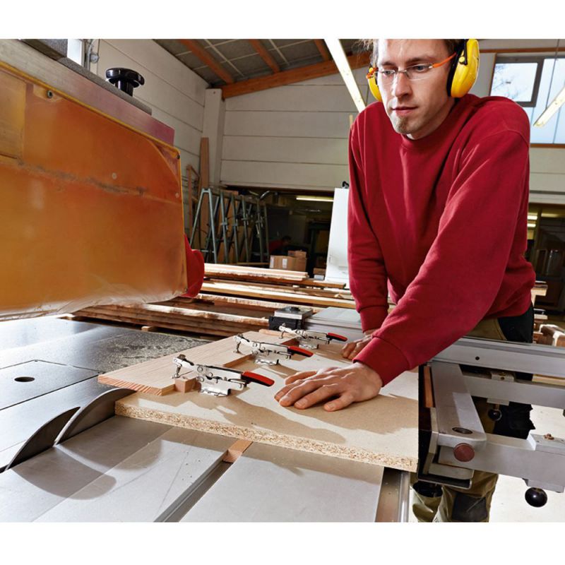 - Powerful and gentle: Even sensitive workpieces, e.g. with veneered or varnished surfaces, can be gently clamped: due to moving pressure plate with removable protective cap due to clamping force regulation via adjustment screw in the joint