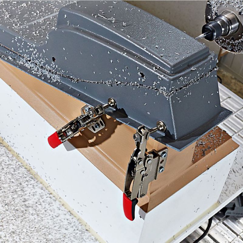 - Ergonomic handle The plastic injection moulded and ergonomically designed handle fits well in the hand and has a very good grip. Horizontal toggle clamp with open arm and vertical base plate STC-HV