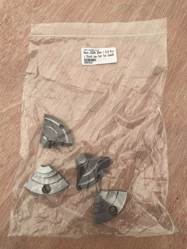 The NOVA JS20N Mini Jaws enrich the NOVA chuck system by extending its potential into the mini turning area. The 20mm jaw expands into a recess between 20mm and 41.5mm diameter. When gripping a spigot the range is 8mm to 30mm diameter. These jaws will also hold square stock between 10mm and 20mm.