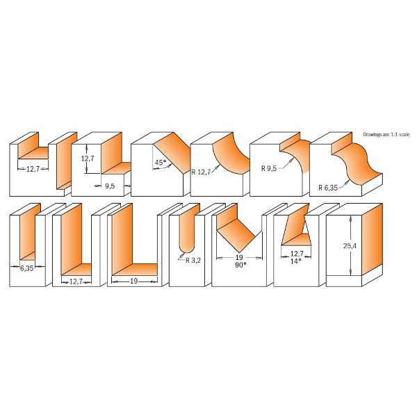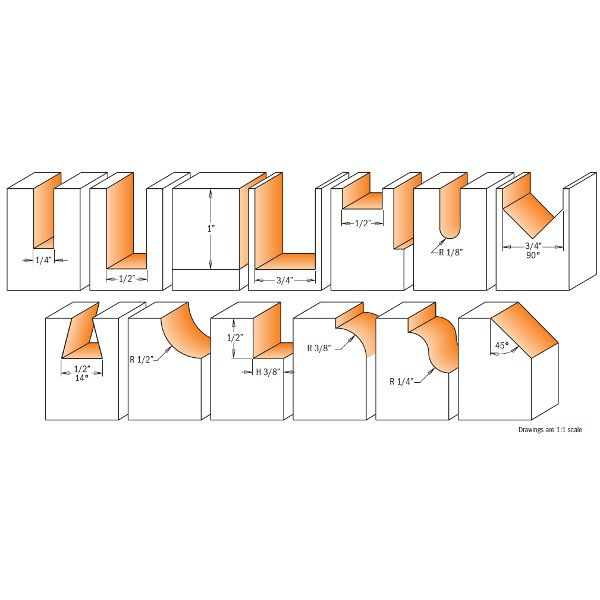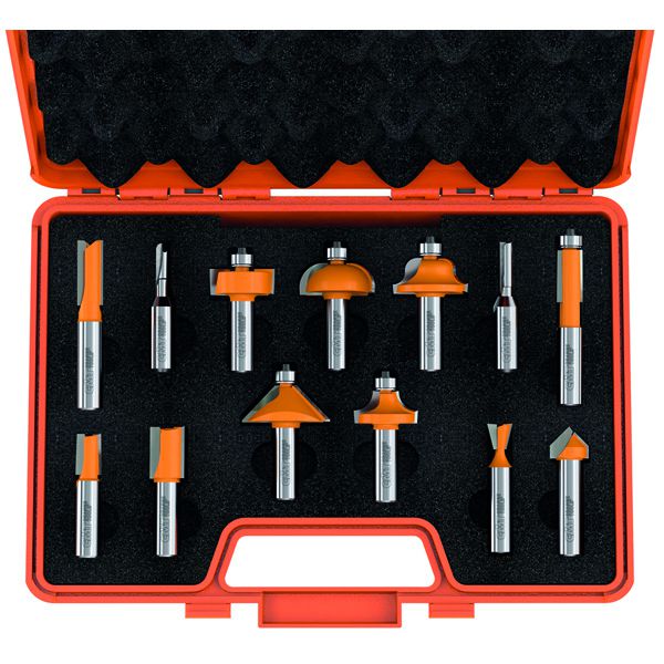 - Containing 13 of CMT’s most frequently used 12.7mm (1/2") shank router bits featuring the finest steel and carbide, plus CMT’s baked-on orange PTFE non-stick coating, this compact case is beautiful and convenient for your woodworking needs. You will have exactly what you need within hand’s reach.