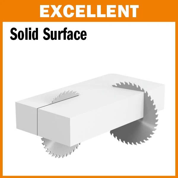 - Solid surface materials (Dupont Corian®, Wilsonart Gibralter®, SSV Fountainhead®, Varicor®...) and thick plastic.
