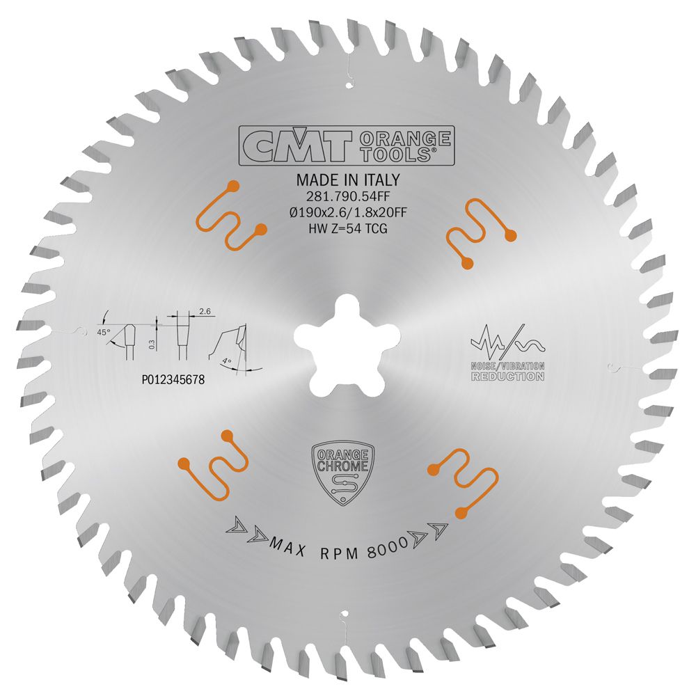 CMT Low Noise Laminated and Chipboard Saw Blade 190mm dia x 2.6 kerf x 20 (Festool FF) bore Z54 TCG
