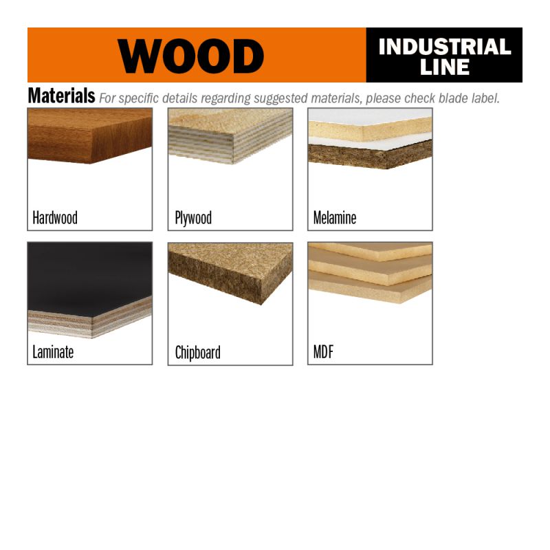 - Material: single or double-sided laminated panels. Hardwood, plywood, melamine, laminate, chipboard, MDF.