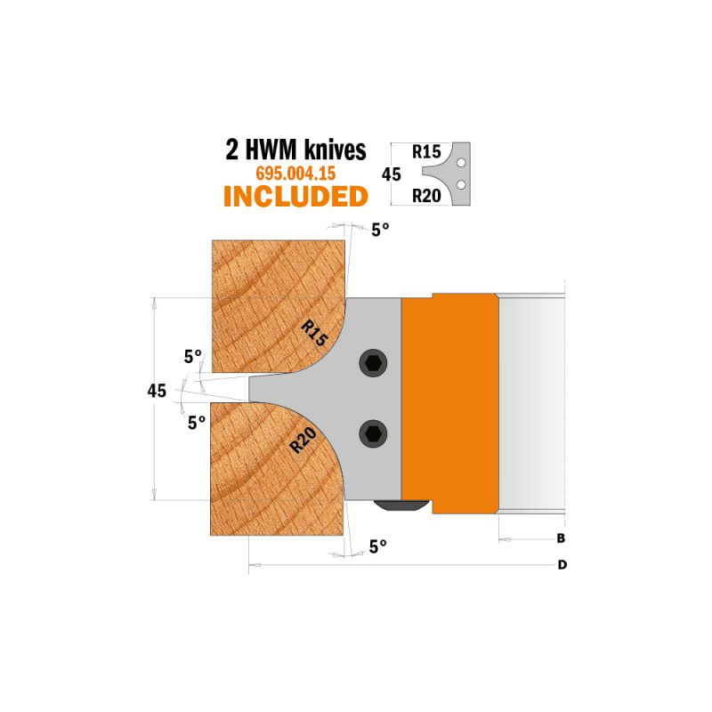 - Standard cutter heads are sold with knives featuring radii 15 and 20mm; one more knife set is available for radii 12-18mm.