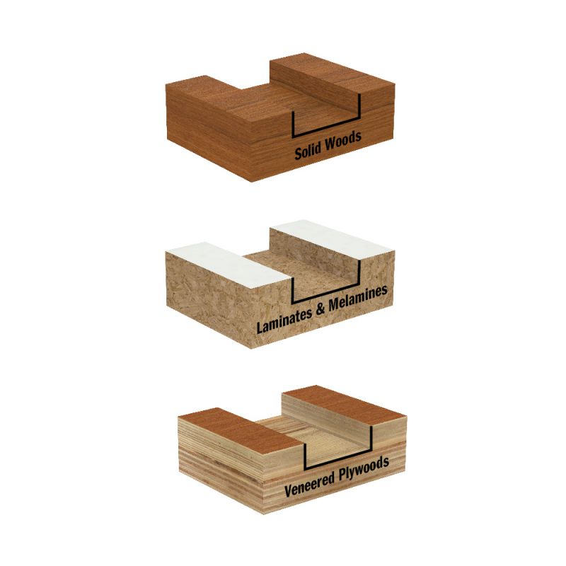 - For flat bottom grooves and virtually splinter free cuts in solid wood, laminates, melamines and veneer plywood.