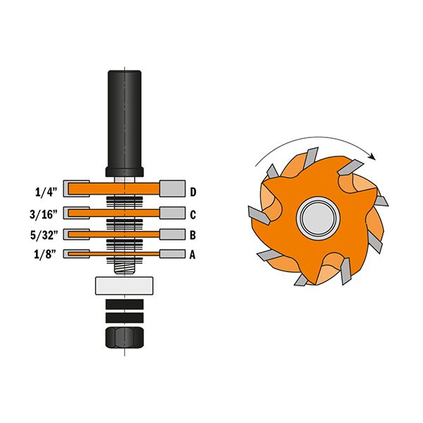 - Note: the carbide edges of the cutters should never touch; arrange the shims as illustrated below. Use only the thicknesses provided in the set. Be sure all cutters are assembled in the proper right rotational direction below. Looking down the arbor the cutters will turn clockwise.