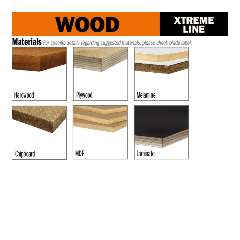 - Hardwood, plywood, melamine, one-sided or double-sided plastic-laminated panels, chipboard, MDF, HDF.