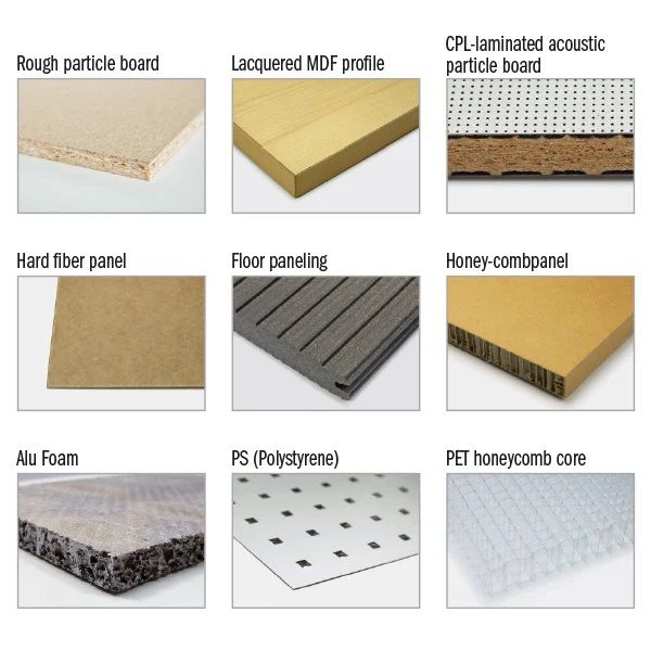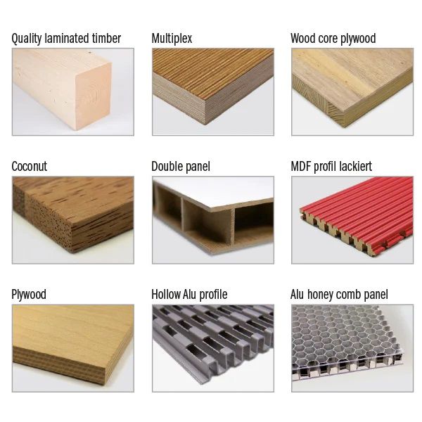 - Gypsum plasterboard, veneered laminated wood, plywood, multiplex, double panel, floor panelling, honeycomb panel, solid wood panel, hollow alu profile, alu honeycomb panel, HPL laminate, polyethylene, board material, melamine laminated particleboard, HPL laminated particleboard, Lacquered MDF. (See attached pictures for more).