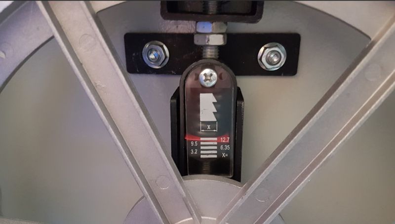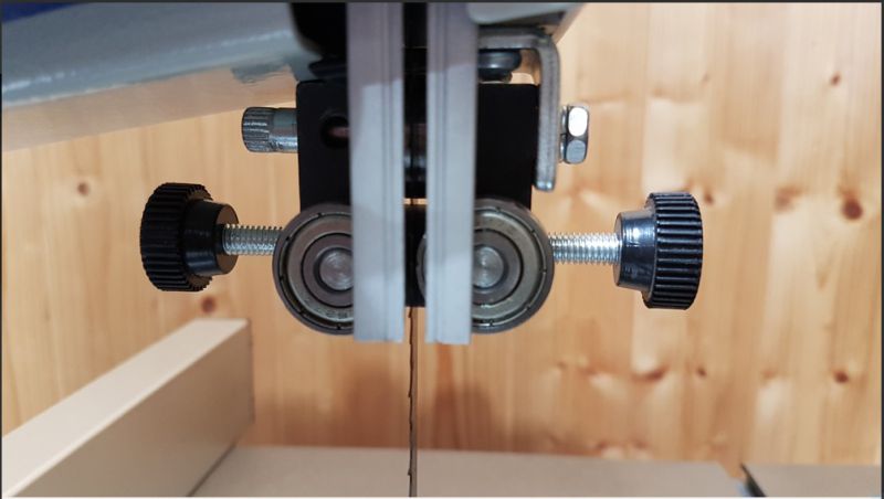 - The rack & pinion blade guard design is adjusted by using a dial on the side of the machine. The blade is then guided by two side facing bearings and a rear thrust bearing attached to the end of the guard. The side bearings are mounted on an eccentric cam, for faster setting, and can be adjusted without using any tools. The same guide set up is repeated below the table giving maximum blade control and keeping the blade true when a straight cut is required.