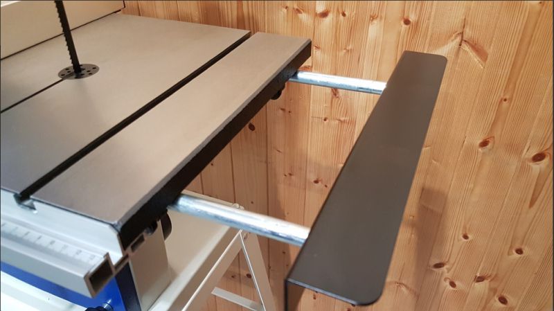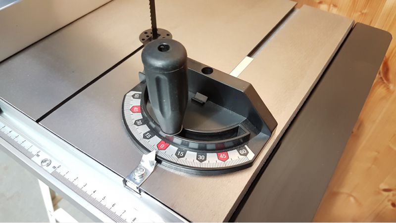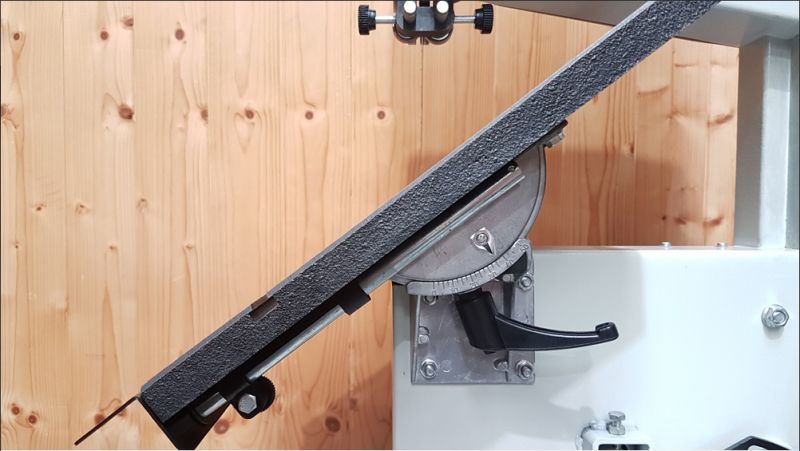- A small sized woodworking bandsaw with a durable precision ground cast iron tilting table with a stop for returning to 90 degrees, after a bevel cut, and T shaped mitre fence slot. When working with larger pieces there is a sliding table extension support adding 100mm to the table width.