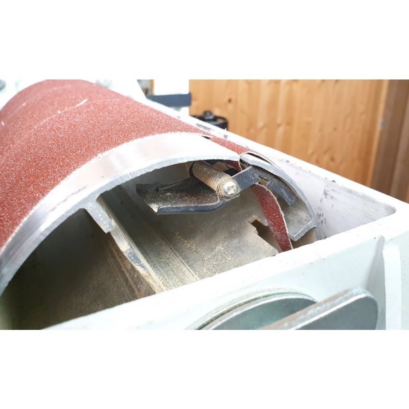 • Changing the sandpaper wrap is a simple task which requires no tools. Our sanding wraps are pre-cut with a taper at each which is clamped into each end of the drum. If you are using a sandpaper roll, you will need to make a template and cut the tapers before fitting.