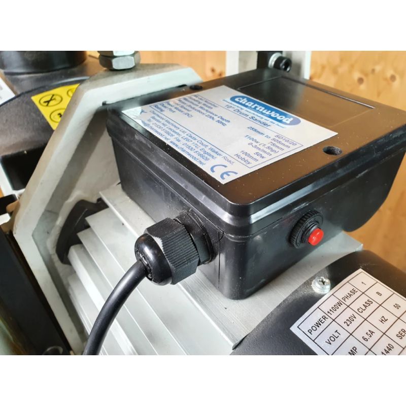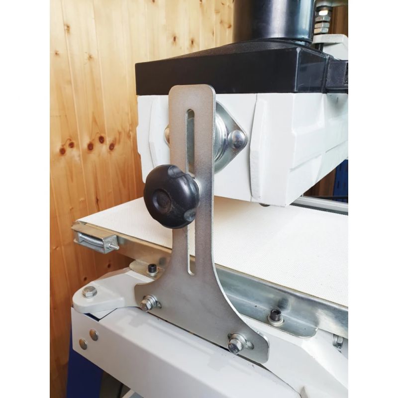 • The single pass capacity of the machine is 250mm (10″). However, by removing the side plate (which is fitted with a quick removal mechanism) the work piece can be fed through the now open end of the sander giving a capacity of up to 500mm (20″) by making 2 passes.