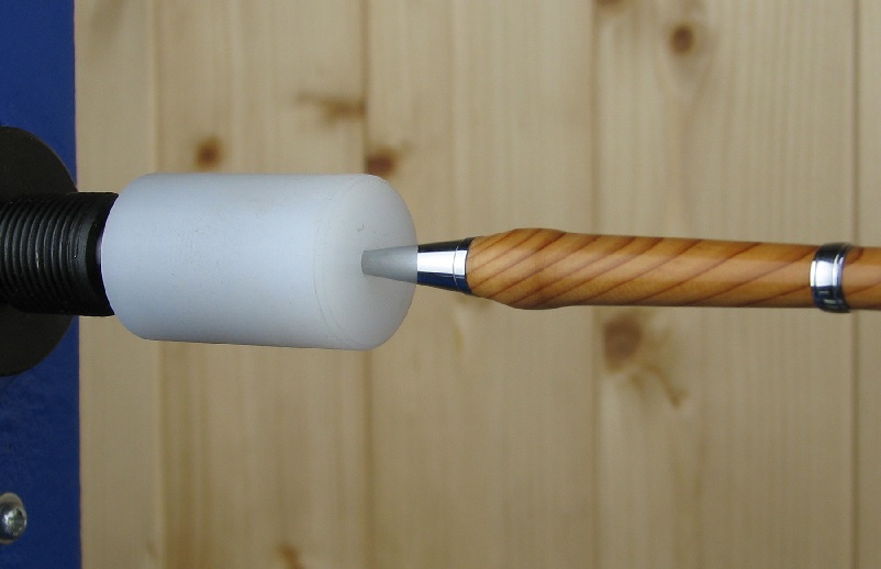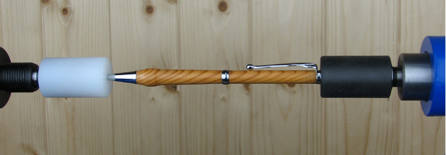 - To use the pen press you put the white pad into the headstock taper and the black pad into the tail stock, insert the nib into the white pad and slide the tails stock in until the black pad is pressed against the other end and lock off . Then simply wind the tailstock shaft forward which will press the pen parts together. Once the parts are pressed together unwind the tailstock and remove the pen.