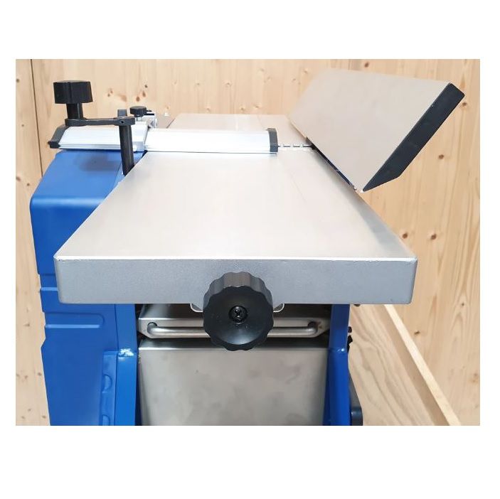 - The steel thicknessing bed has an extension arm on the outfeed side and is supported in each corner by chain driven adjusting screws. Once the height is set, rubber coated feed rollers pass the timber through the high speed cutter block leaving a beautiful finish with no roller marks.