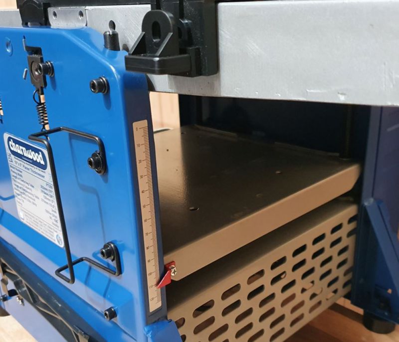 The steel thicknessing bed has an extension arm on the outfeed side and is supported in each corner by chain driven adjusting screws. Once the height is set, rubber coated feed rollers pass the timber through the high speed cutter block leaving a beautiful finish with no roller marks.