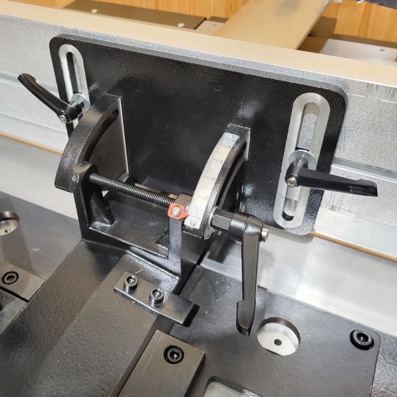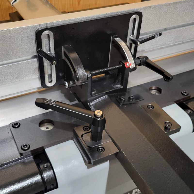 - The extra long cast iron infeed bed is quick to adjust using a lever, with a clear scale to read the setting before locking the position. The bridge guard has simple controls to set the height over the cutters and the gap to the side fence. It can also be lifted up and locked completely out of the way. The side fence is mounted on a sturdy cast iron support bracket. The fence can be positioned anywhere across the width of the cutter block, useful for getting even wear on the cutters when working mainly with narrower materials. The fence can also be tilted back to 45 degrees.