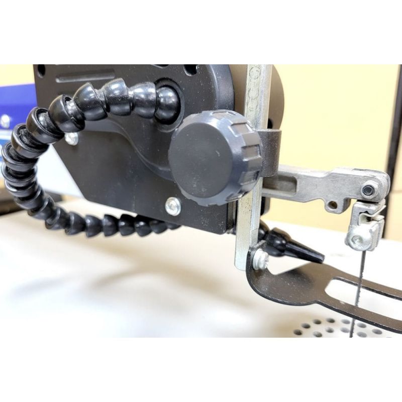 - Unlike tilting table scroll saws, the static horizontal table of the SS18F allows very easy access and sight of both top and bottom blade hangers and clamps.