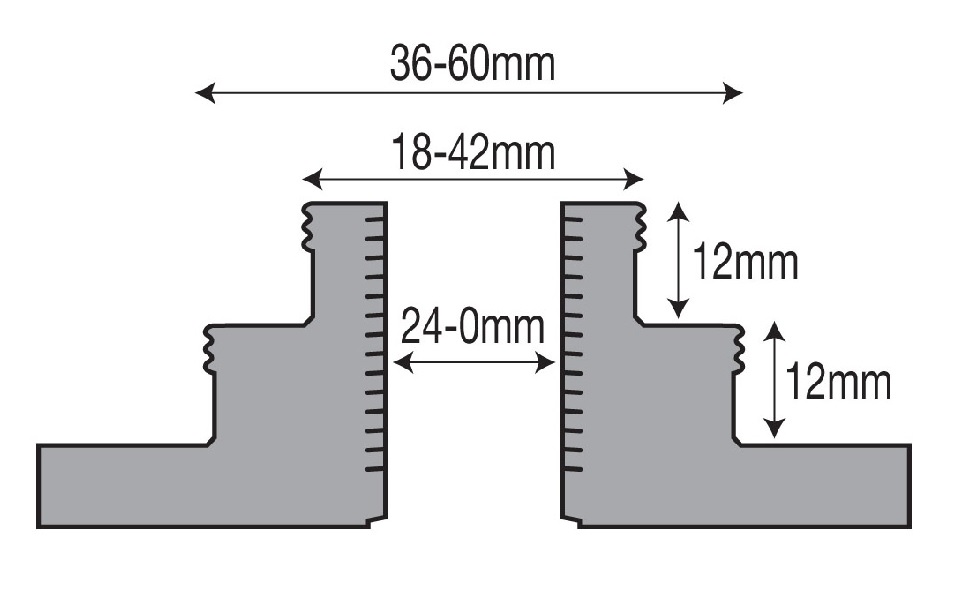 Step 1 projects 24mm from the base of the jaw, Step 2 projects 12mm.
