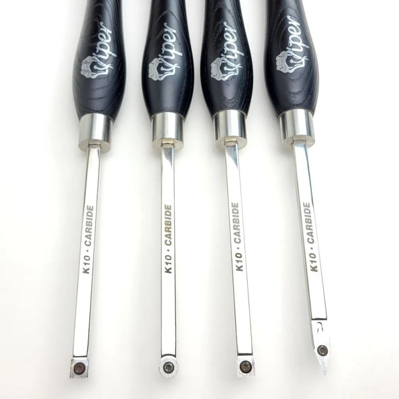 - The handles are 320mm long and made from European Black Ash. A distinctive silver ferrule connects a square shaft which is chrome finished and laser etched. On the end is mounted a Tungsten Carbide (TC) cutting tip. The 4 razor sharp cutting tips have different shapes to achieve different types of cut. Carbide cutters are presented to the timber at 90 degrees and cut with a scraping action. This is a much simpler skill to learn when compared to using a traditional bowl gouge, which is what makes it especially suitable for beginners.
