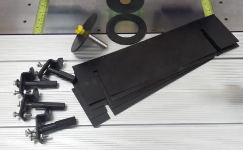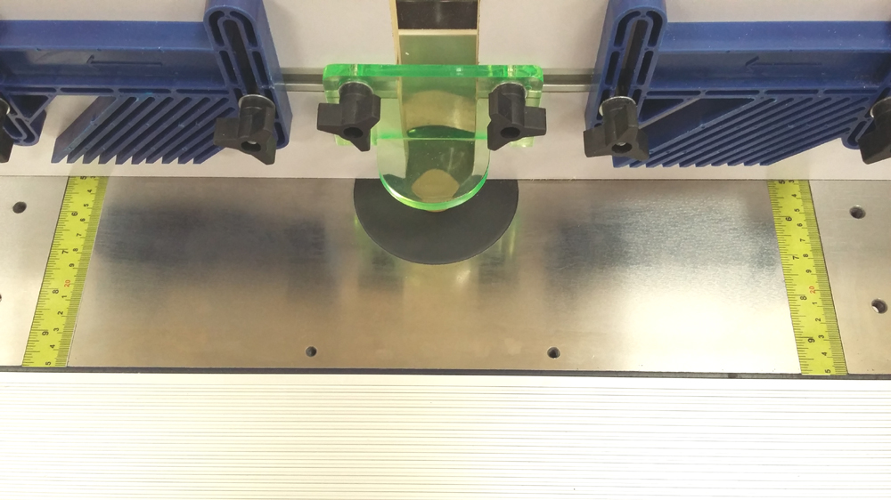 - Any sized router can be mounted to this table using the clamping set provided. To give easy access to the router when changing settings the whole table top is hinged and supported by gas filled struts to counteract the heavy weight of the cast iron top.