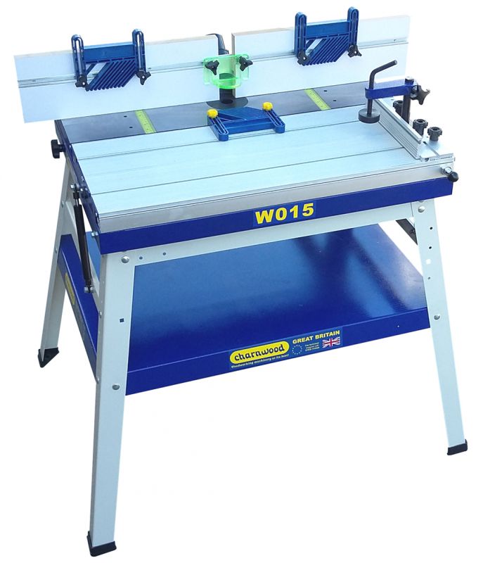 - W015 is a heavy duty routing table with a strong steel floorstand and a table top of cast iron. The front half of the table is actually a sliding bed and is fitted with a fence and work clamp to make short work of end grain cutting and tenons. This cross cut fence can be fitted anywhere along the length of the table and can also be locked in at 45 degrees.