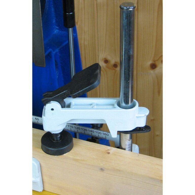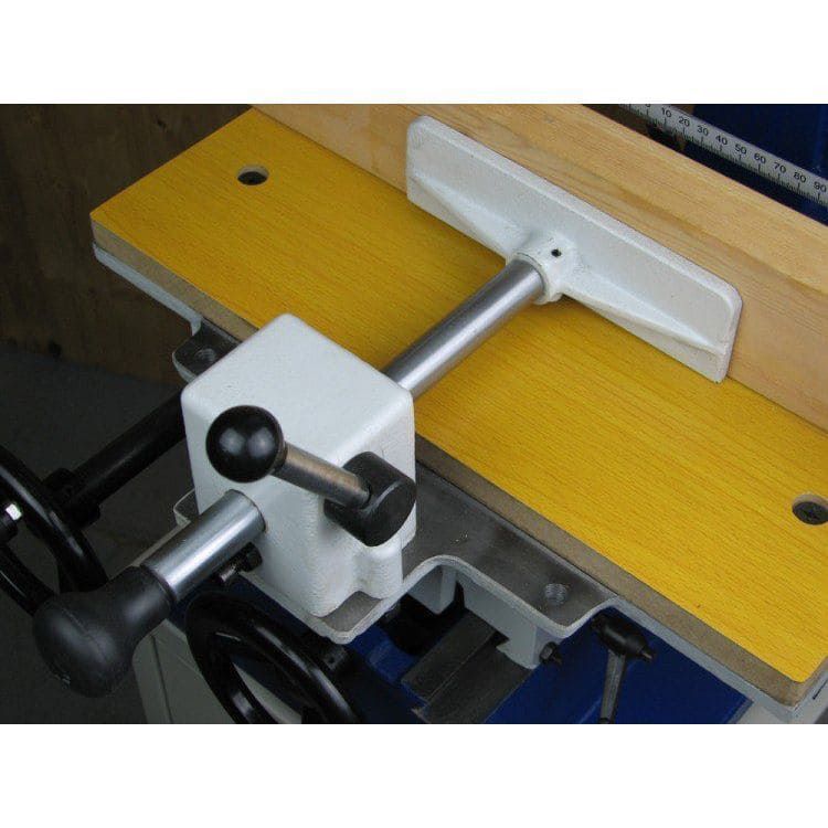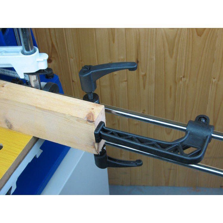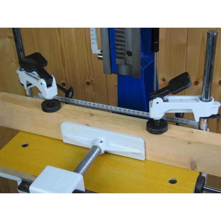 - The timber is held in place by a front clamp with a quick action lock and two further cam lock clamps which hold the timber firmly down against the table, to prevent lifting when raising the chisel.
