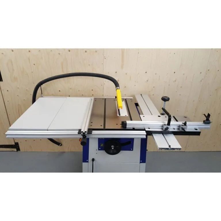 - Supplied with 36 tooth TCT saw blade, sliding table, sliding mitre fence, side extension tables, floor stand, 4 adjustable feet, push stick, 1.7m power cable and UK 3 pin plug.