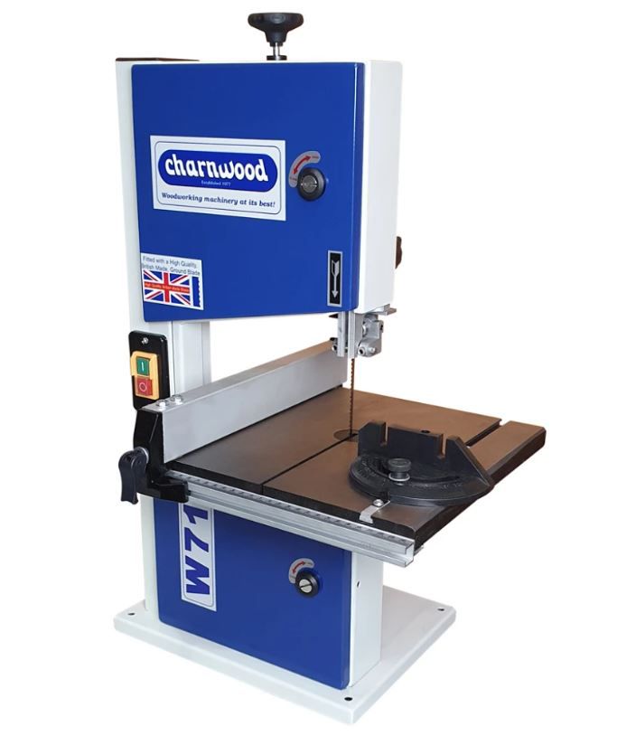 - Our W711 woodworking bandsaw is supplied with rip fence, sliding crosscut mitre fence adjustable 60 degrees each way, 1/4" British made blade, NVR switch, 40mm diameter extraction outlet, cable and plug. The dust kit converts the outlet for use with a 100mm extractor system.