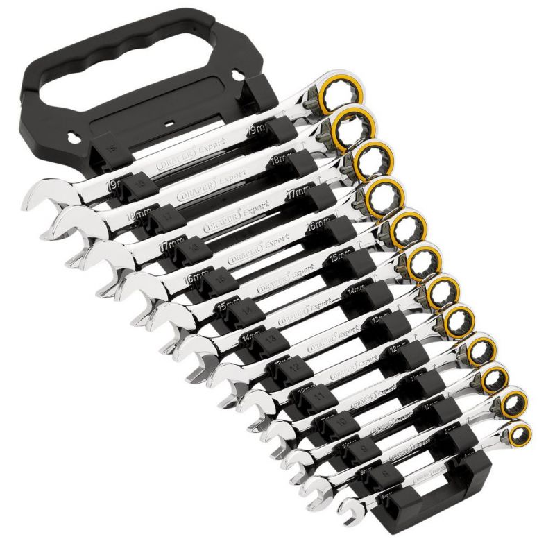• This 12-piece Draper Expert HI-TORQ® metric reversible ratchet combination spanner set is manufactured from hardened and tempered chrome vanadium steel, with a mirror chrome plate finish for corrosion protection.