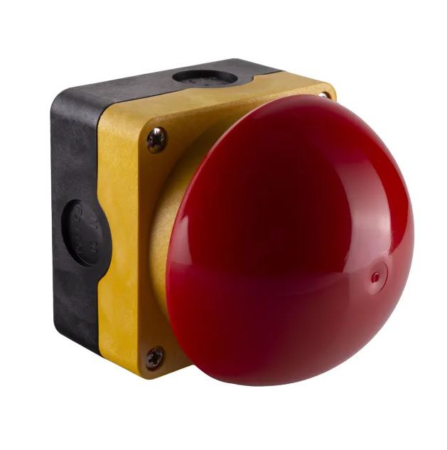 - This emergency stop switch has a red button with a yellow and black base and is supplied as a complete unit