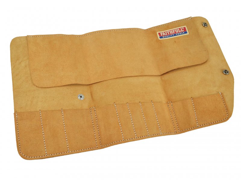 The Faithfull 10 Pocket Leather Tool Roll is manufactured from high-quality leather. Contains ten pockets of various sizes and is ideal for storing small tools such as chisels, auger bits, screwdrivers and spanners. It has a stud fastening system for ease of use.
