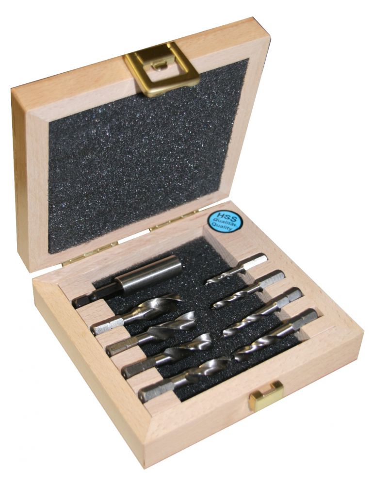 • FAMAG 9pcs HSS-ground 1/4" Hex Short Shank Brad Point Drill Bit Set in Wooden Case, 1596508 - 9 pcs