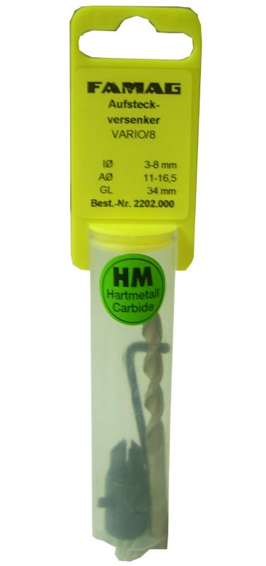 - Professional carbide tipped adjustable countersink, countersinking angle 90° or 180°, two-part version. Can be clipped universally on all drill bits Ø 3-8 mm, incl. allen key. Ø 8 mm must be pushed into the countersink from behind with the flute in front